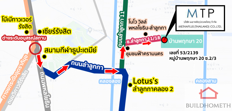 เริ่มจากถนนพหลโยธิน ⇒ ถนนลำลูกกา ⇒ ถนนลำลูกกา 11 ⇒ ซอยลำลูกกา 11/18 ⇒ บ้านพฤกษา 20 ⇒ ซอย 2/3 ⇒ เลขที่ 53/2139 รับเหมาก่อสร้าง เมธาพลัส (METHAPLUS)
